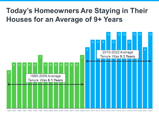 From 1985 to 2009, the average length of time homeowners stayed in their homes was roughly six years. But according to the National Association of Realtors (NAR), that number is higher today. Since 2010, the average home tenure is just over nine years (see graph below):