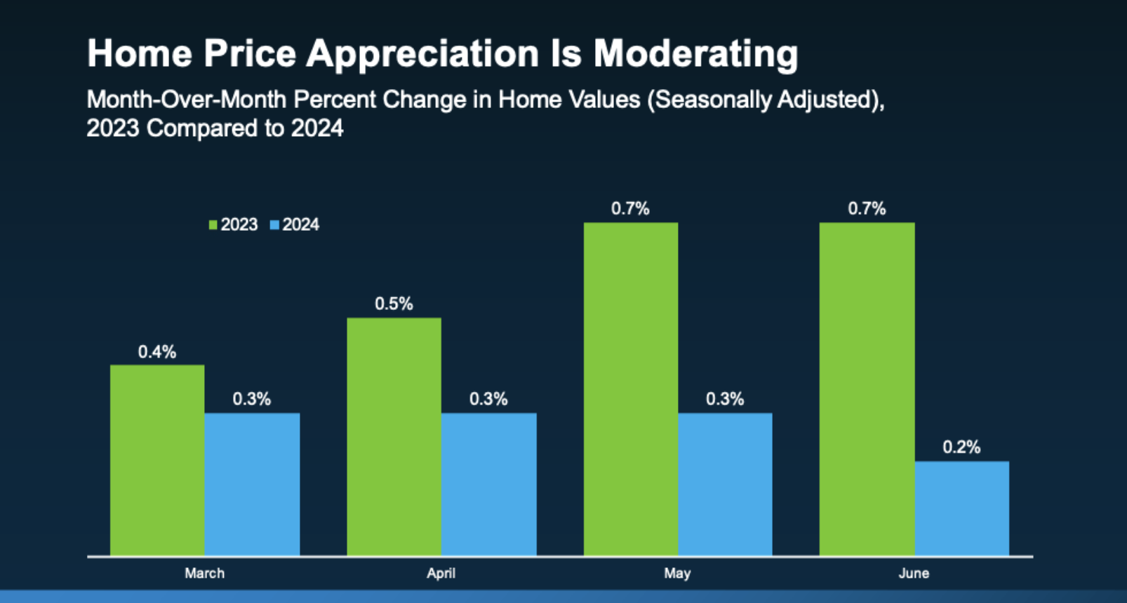 Throughout the country, home price appreciation is moderating. What that means is, prices are still going up, but they’re not rising as quickly as they were in recent years. The graph below uses data from Case-Shiller to make the shift from 2023 to 2024 clear: